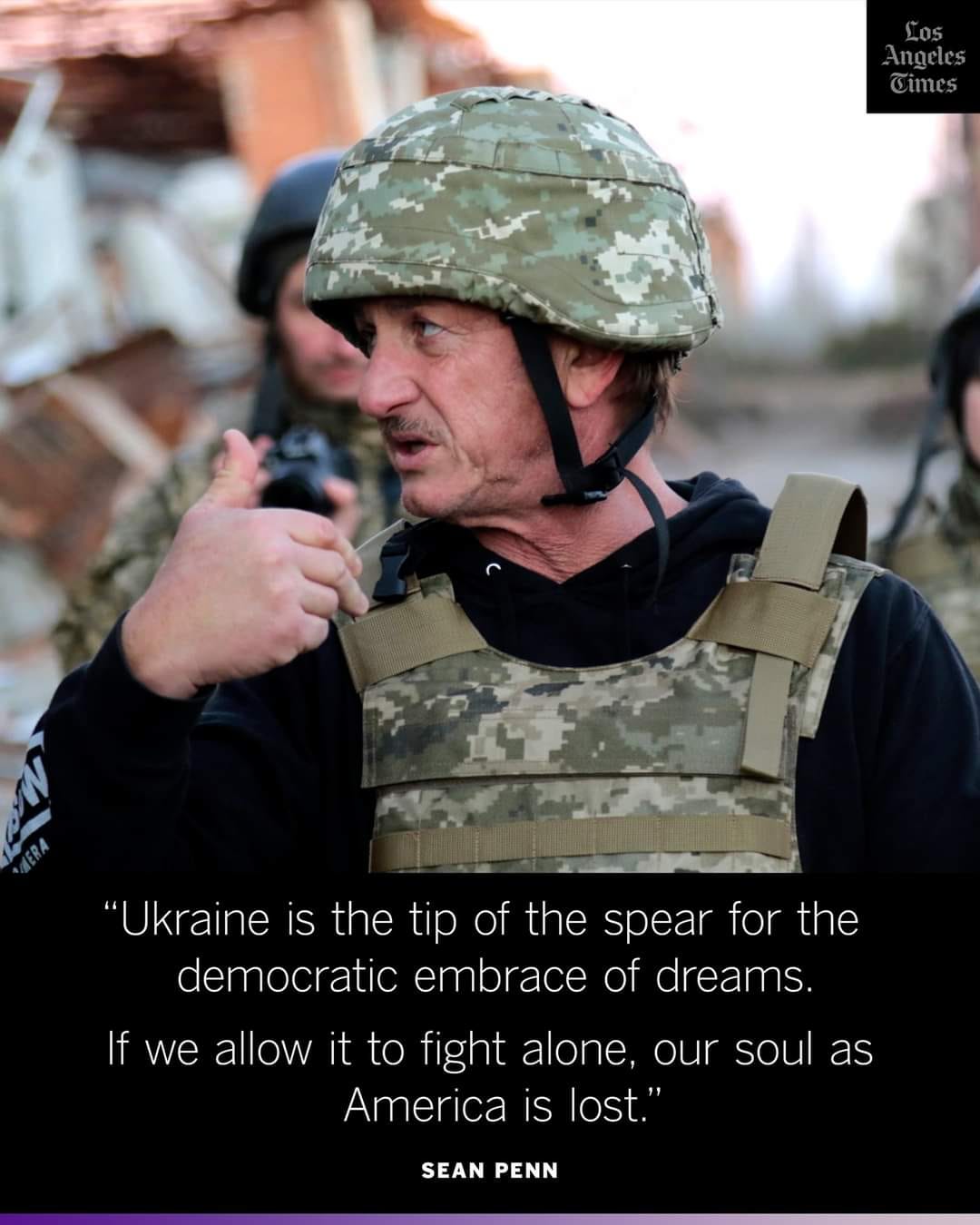 And then, suddenly, Sean Penn pops up in Ukraine where he just happens to be filming a documentary. Here he is in full battle gear, in an article for the Los Angeles Times: