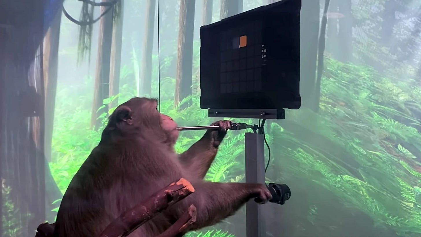 Here we have Musk’s macaque, named Pager, sucking on a banana smoothie while playing pong with his mind. How can it perform such a trick? Well, it isn’t a trick. It has Musk’s Neuralink implanted in both sides of its brain. If it plays as it has been taught to do, it gets its treat.