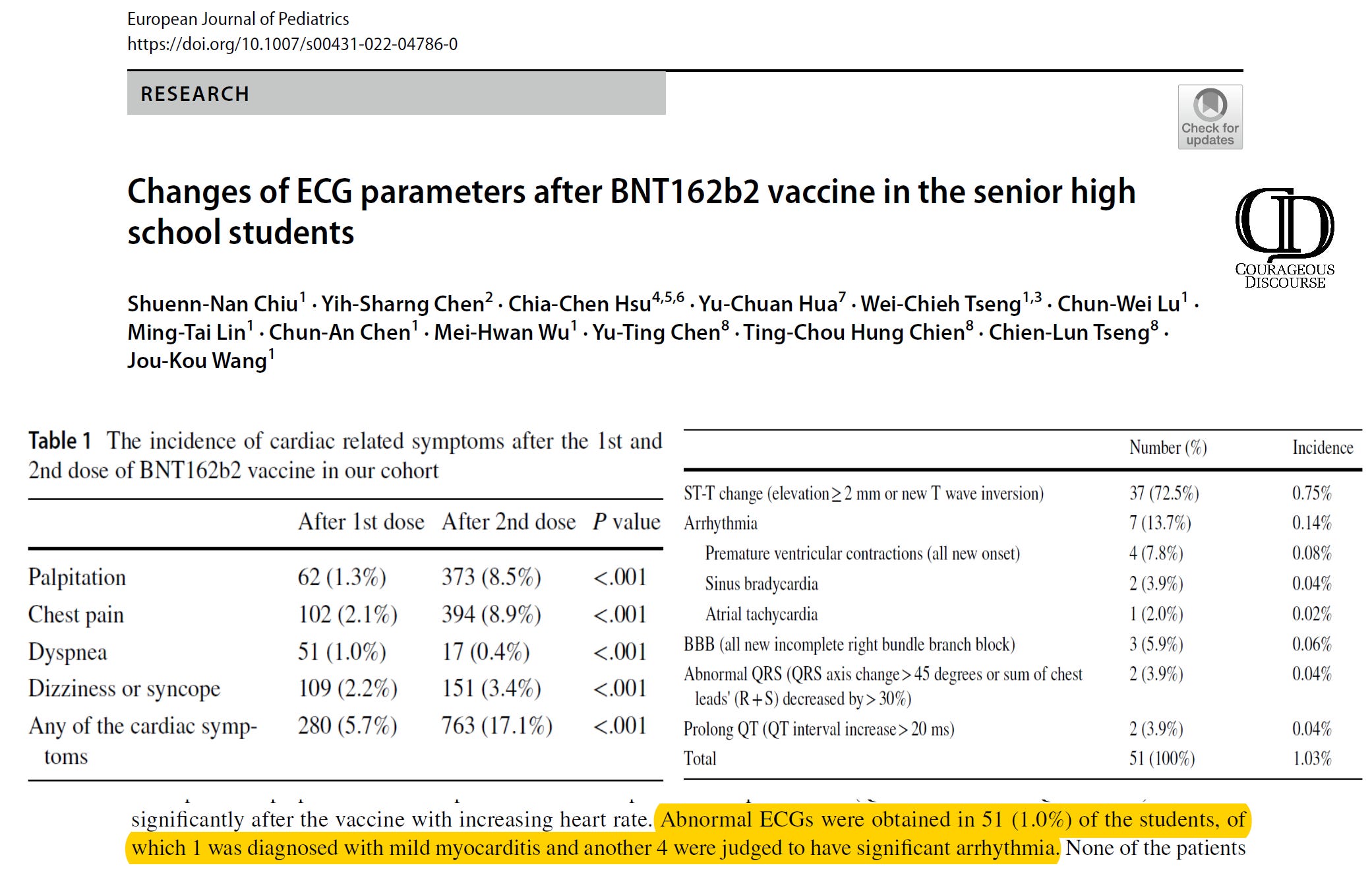 Conducted by Chiu SN, Chen YS, Hsu CC, Hua YC, Tseng WC, Lu CW, Lin MT, Chen CA, Wu MH, Chen YT, Chien TH, Tseng CL, Wang JK. Changes of ECG parameters after BNT162b2 vaccine in the senior high school students. Eur J Pediatr. 2023 Jan 5:1–8. doi: 10.1007/s00431-022-04786-0. Epub ahead of print. PMID: 36602621; PMCID: PMC9813456.