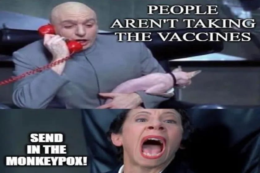 Those of us who have seen through the lies up until this point look at monkeypox and laugh. It isn’t worth our time or consideration, except to make some really funny memes about it. Just like we did about toilet paper in the beginning of Covid.