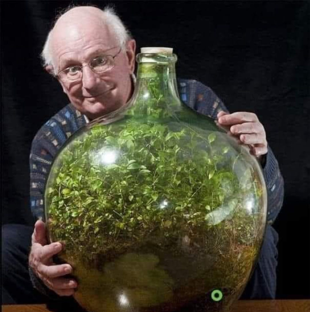 80-year-old David Latimer planted a terrarium garden on Easter Sunday in 1960. He placed some compost and a quarter pint of water into a 10-gallon glass carboy and inserted a spiderwort sprout, which is not typically an indoor plant, using wires.