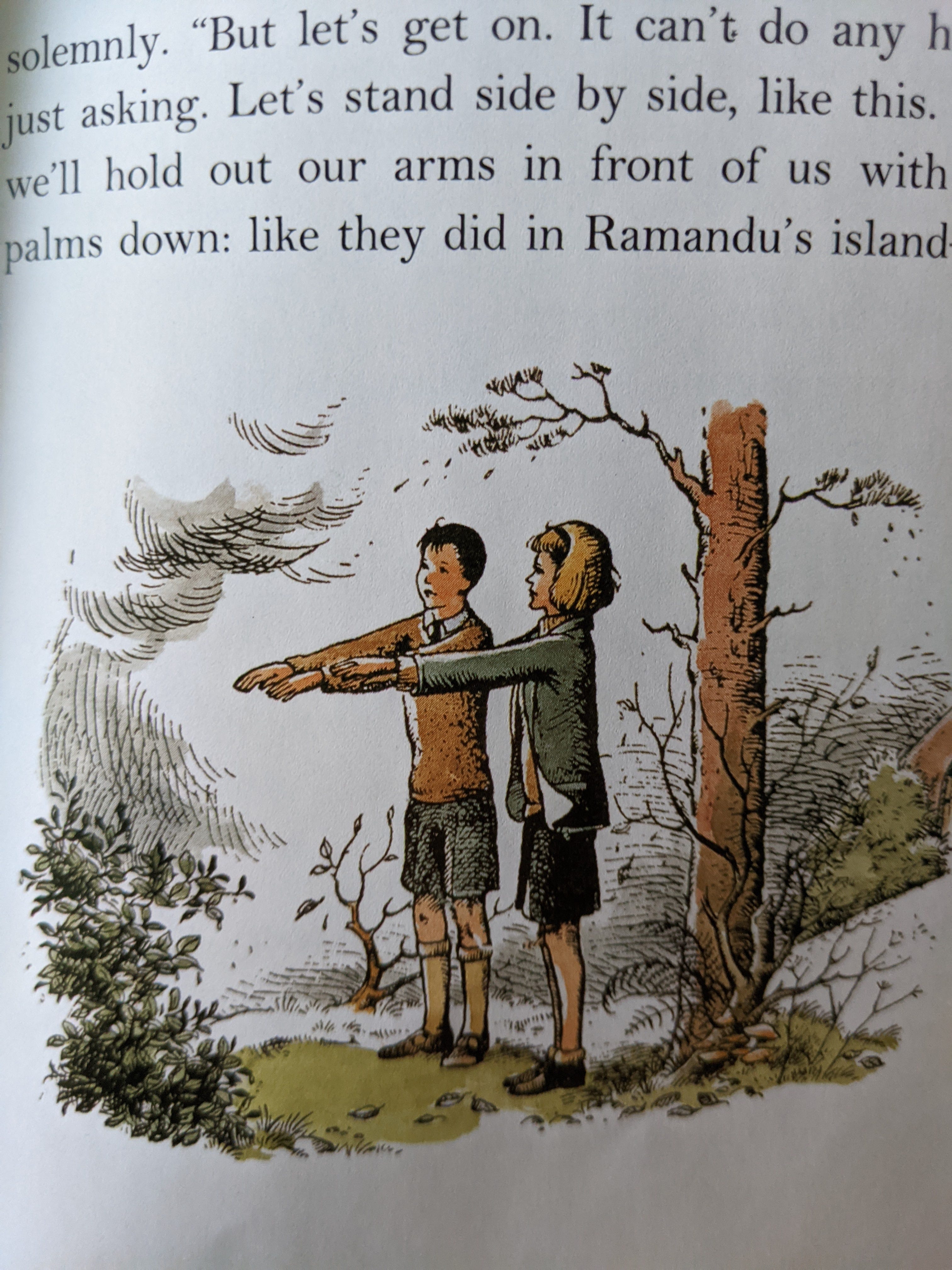 “They expected to see the gray, heathery slope of the moor going up and up to join the dull autumn sky. Instead, a blaze of sunlight met them. It poured through the doorway as the light of a June day pours into a garage when you open the door. It made the drops of water on the grass glitter like beads and showed up the dirtiness on Jill’s tear-stained face.”
