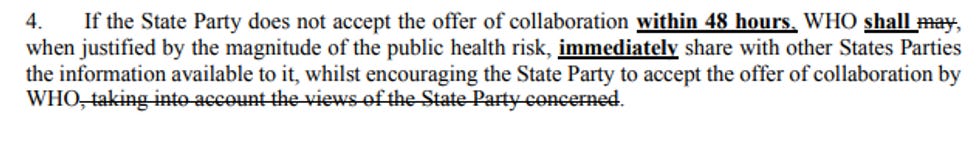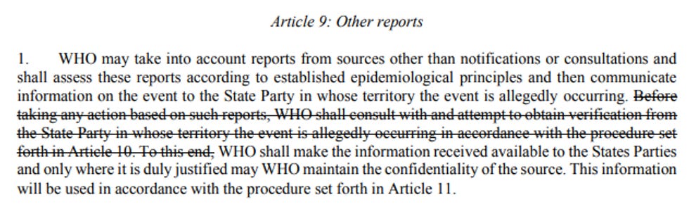 The director-general of the WHO will have the power to declare a public health emergency in a country and unilaterally coerce its citizens to take certain actions. The proposed amendment deletes a critical sentence from Article 9 of the 2005 International Health Regulations: “WHO shall consult with and attempt to obtain verification from the State Party in whose territory the event is allegedly occurring…”
