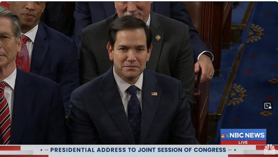 Marco Rubio wasn’t the only one called out last night. When it came to acknowledging Attorney General Pam Bondi, the cameras did not fall on her. She was not given the opportunity to stand in the spotlight to loud applause. She has been relegated to the hot seat, due to the lame release of the Epstein Files, as I wrote about here. At least she could have given the lack of content a better spin.