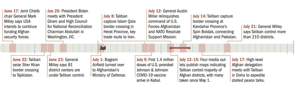 The timeline below shows Milley “publicly acknowledging increasing Taliban control of Afghanistan as the military he leads prepared to leave”: